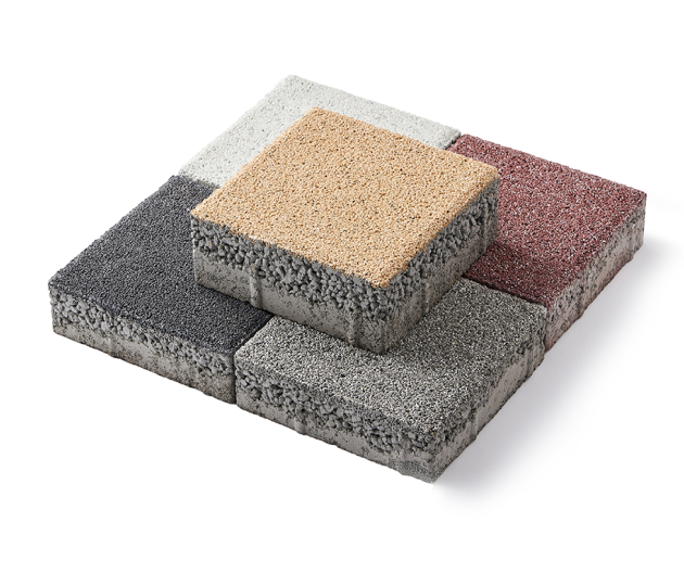 투수기능을 최대화하고 겨울철 동결융해로 인한 표면층 박리 현상을 개선한 표면층, 일정한 크기의 골재로 구성하여 투수성과 강도를 높인 중간층, 블록 전체의 강도를 향상하고 마모를 방지하는 슈퍼콘크리트 재질의 기초층으로 구성되어 있습니다. (환경부 혁신제품 인증)