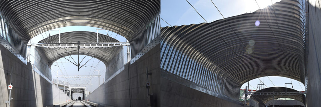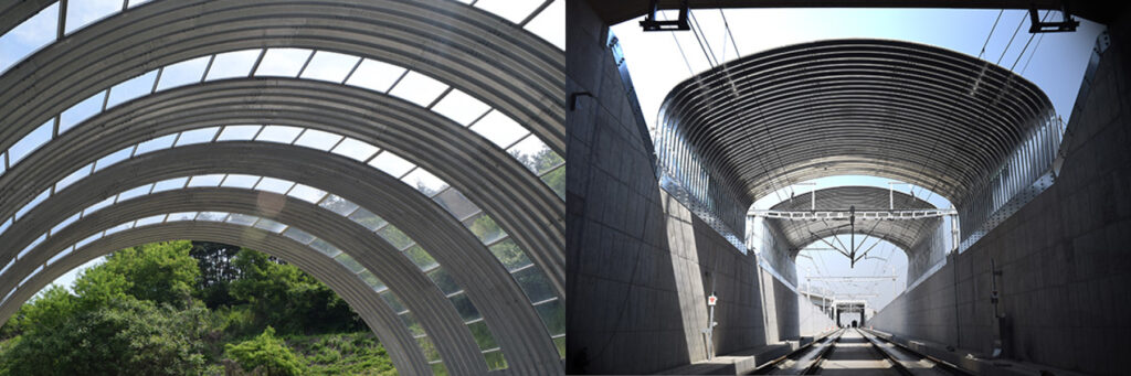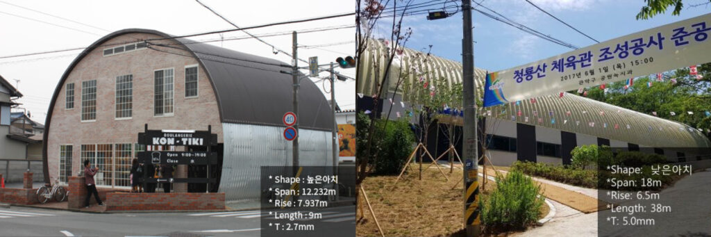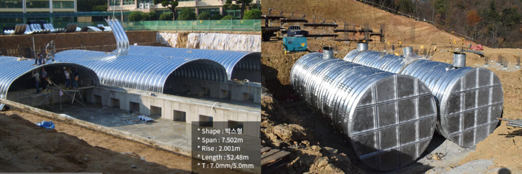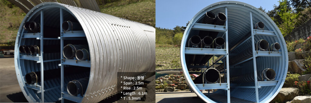 파형강판은 일정 크기의 구조용 강판재 (SS275, SS315, SS450 등)를 파형으로 성형하여 강성을 증가시킨 구조용 자재로, 기존 철근콘크리트 구조물 대비 15~30% 공사비를 절감할 수 있으며, 표면을 용융아연도금(양면 900/㎡ )하여 설계 내구수명을 50~ 100년 이상 확보할 수 있습니다.